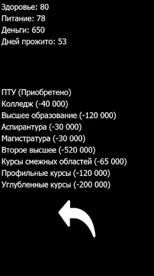 In the training menu, the player gains skills and education, and also increases his income. In the work menu, the character's workflow takes place. The shop menu is used to buy things that can satisfy the needs of the character.