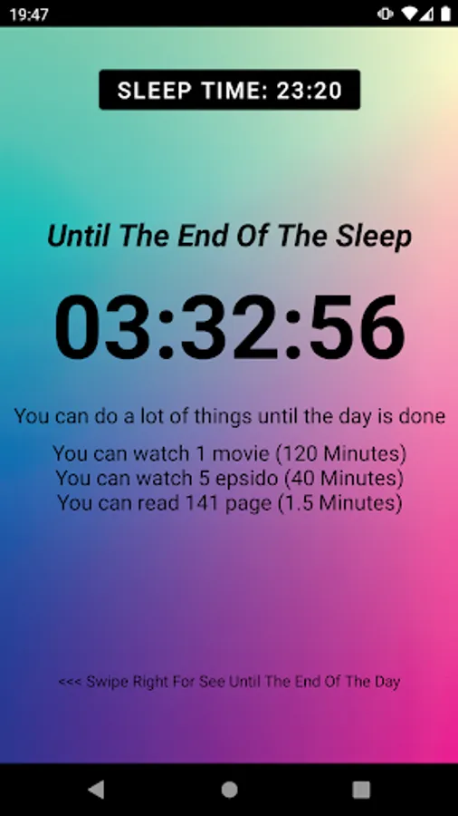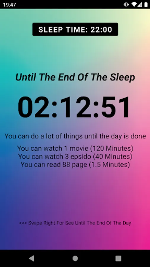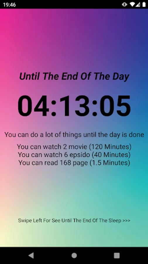 Until End Of Day App shows how many hours are left until the end of the day and gives you information about what you can do with the remaining time. The app can show how many hours are left until your sleep time and give you information about what you can do with the remaining time.