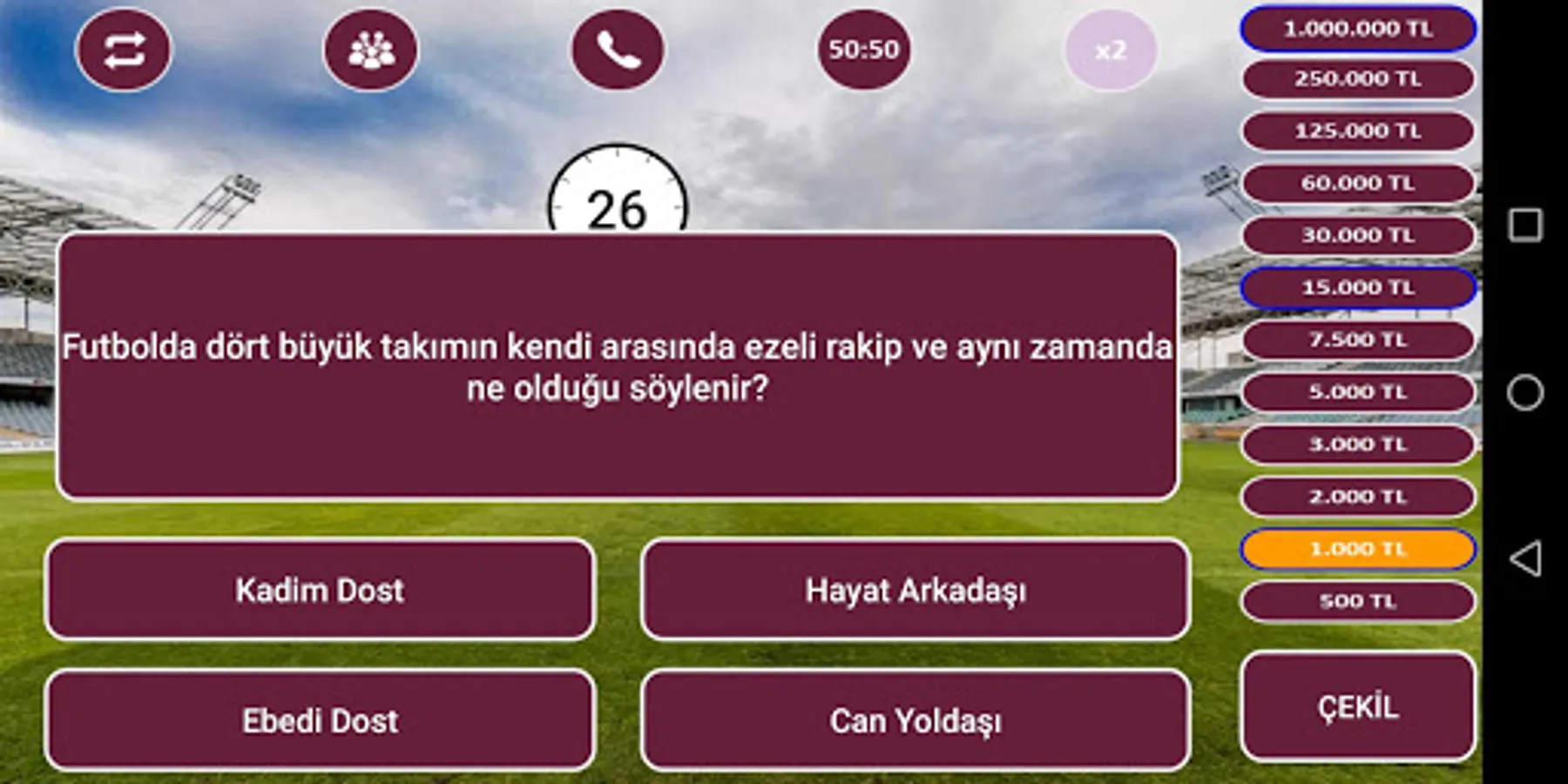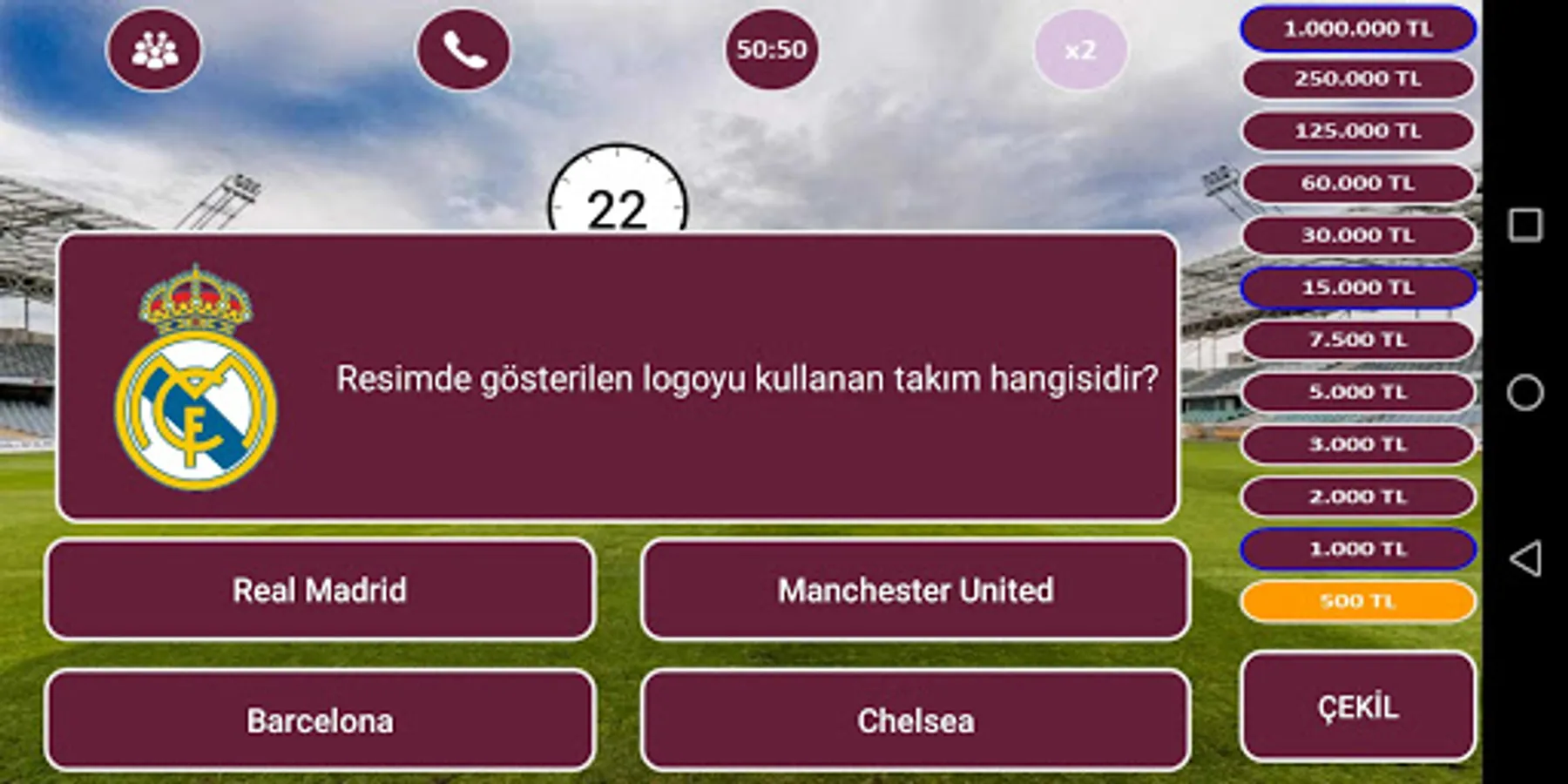 In the world's most comprehensive and high quality Football Quiz, you get 12 questions selected from easy to difficult. There are 1,000 questions in the second question and 15.000 TL in the 7th question. If you answer the question incorrectly in the competition, you will be rewarded for the last dam question. When you withdraw from the competition, you will receive the prize for the last question you answered.