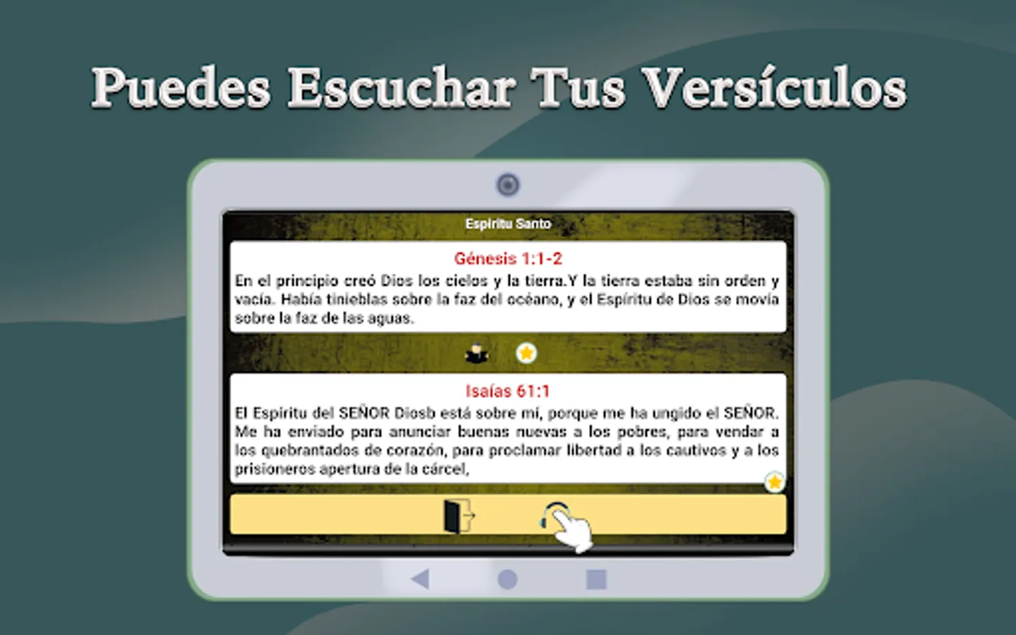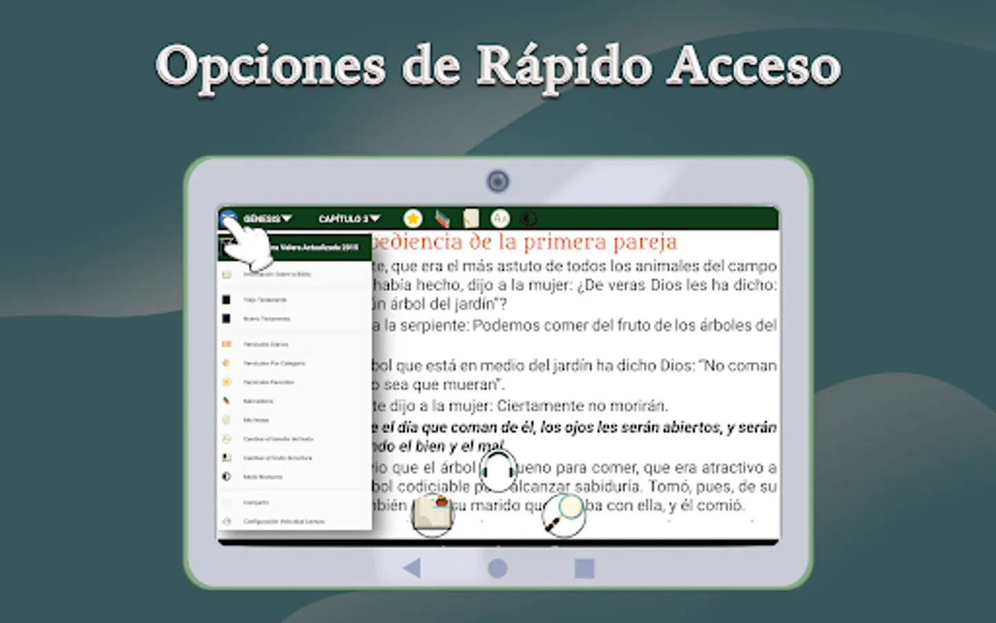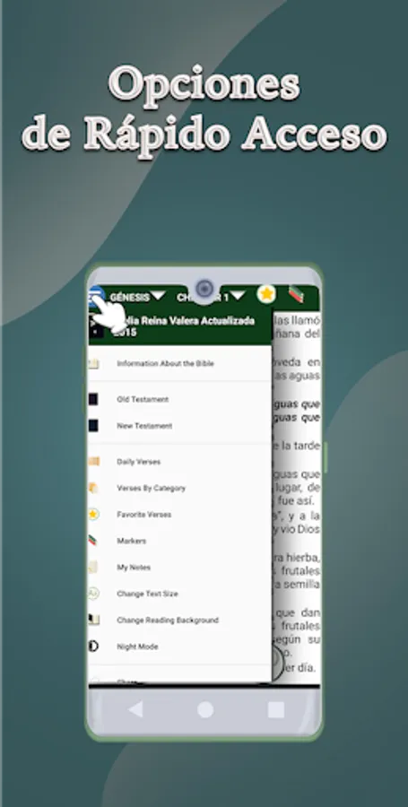 Syntactic order - This revision respects the syntactic order of Spanish so that its reading is more fluid and natural. Characteristics of the application The application is easy to use and allows you to listen and read the scriptures quickly and comfortably, without the need for an internet connection. you can pause the playback of the chapter and listen to it where you left off again and choose the verse where you want it to start when reading. Access to the options menu quickly and easily.