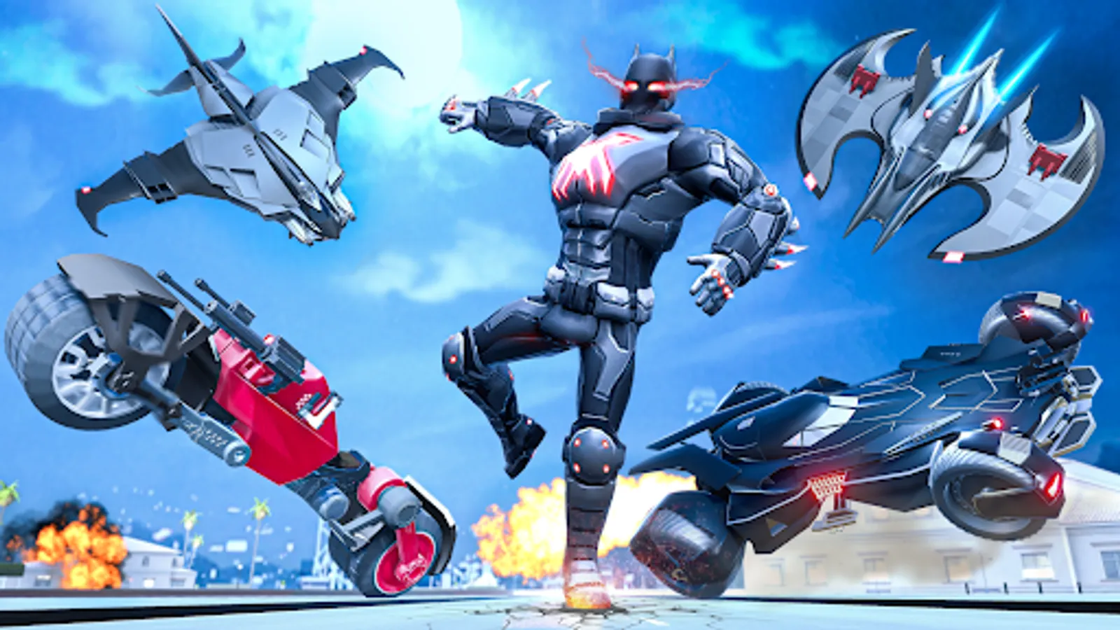 In Hero Bat Robot Bike Game, players get a powerful bat robot on a high-speed Bat motorcycle as they race through the streets of a futuristic city. As the hero bat robot, players will use their Bat motorcycle to speed through the city, dodging obstacles and enemies along the way. Players will need to use their quick reflexes and skillful driving to avoid crashing and keep their Bat motorcycle moving at top speed.