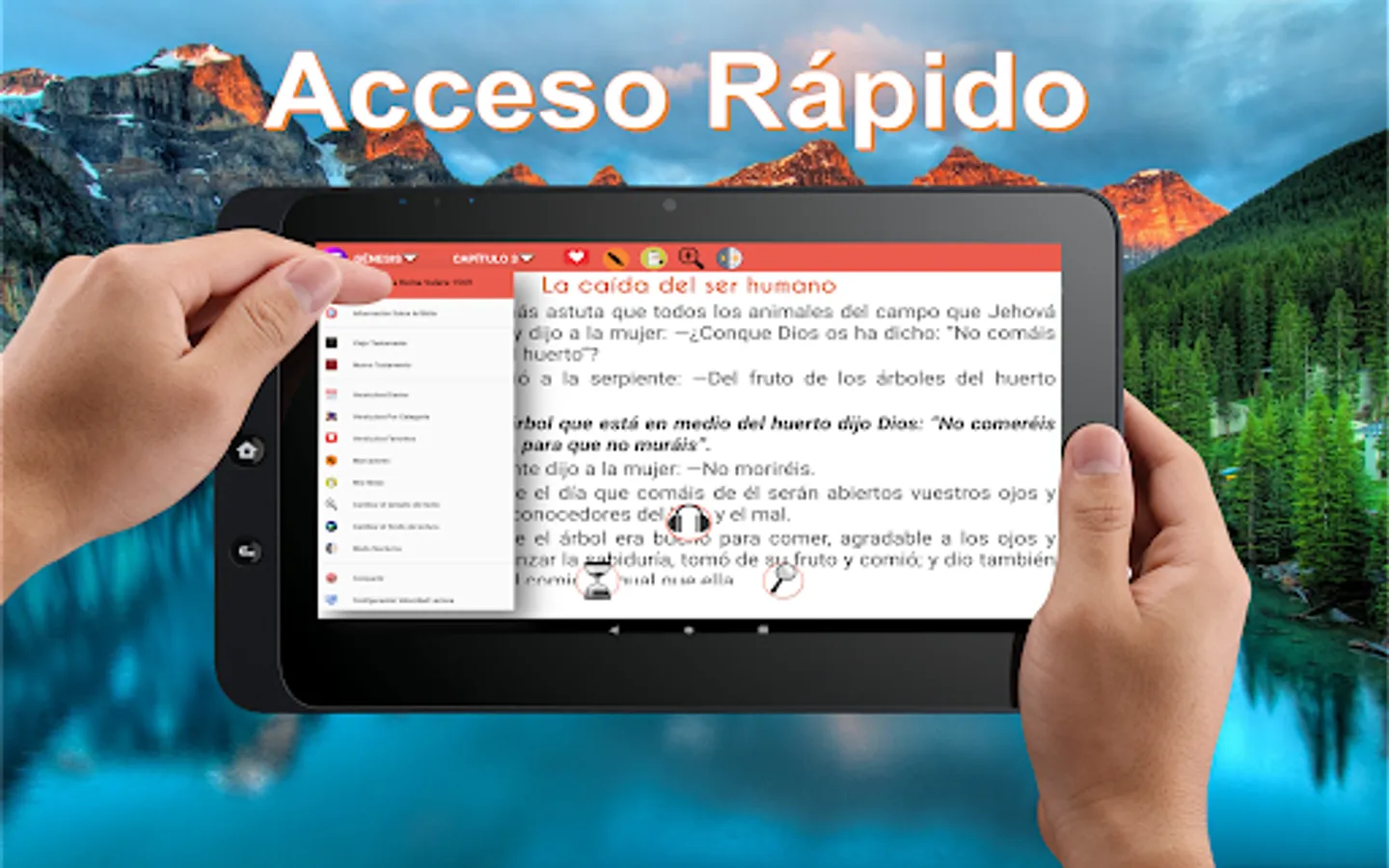 The Search menu will allow you to place a word in a text field and search the entire bible, in the old or new testament. If you specify the search range it may take less time to find matches, but if you select the entire bible it will take longer to find matches. find the results. The settings will allow you to change the size of the letters and the reading mode (Night and day).
