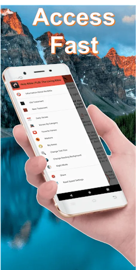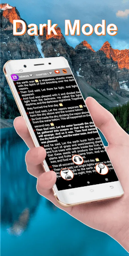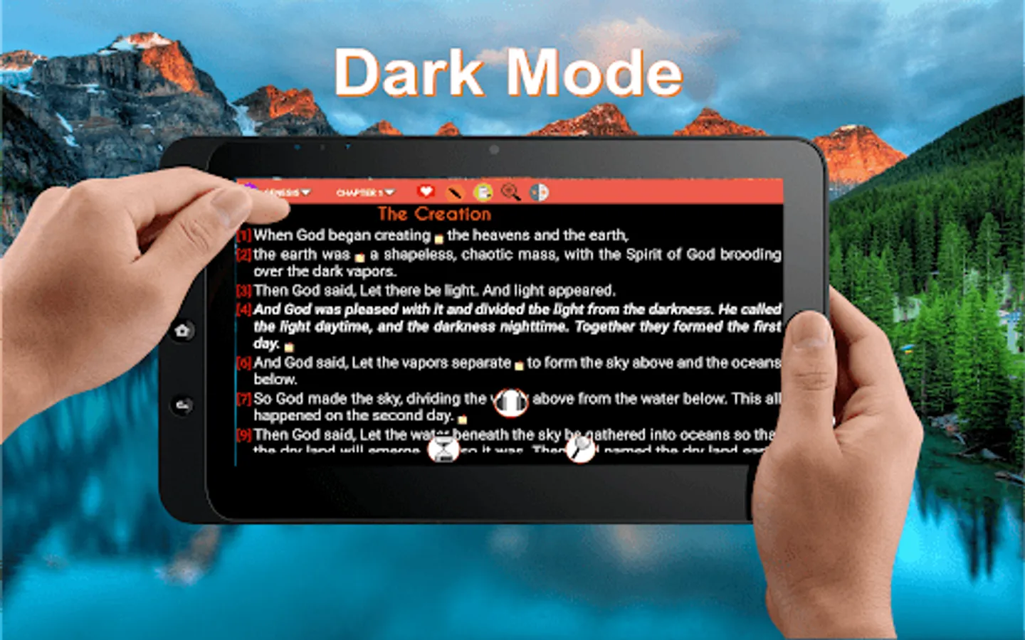 Option to change the text size. Change of reading background of the book. Access to favorite chapters and verses. Search for words in books, chapters and verses. Night mode to facilitate reading and decrease the light of the screen.