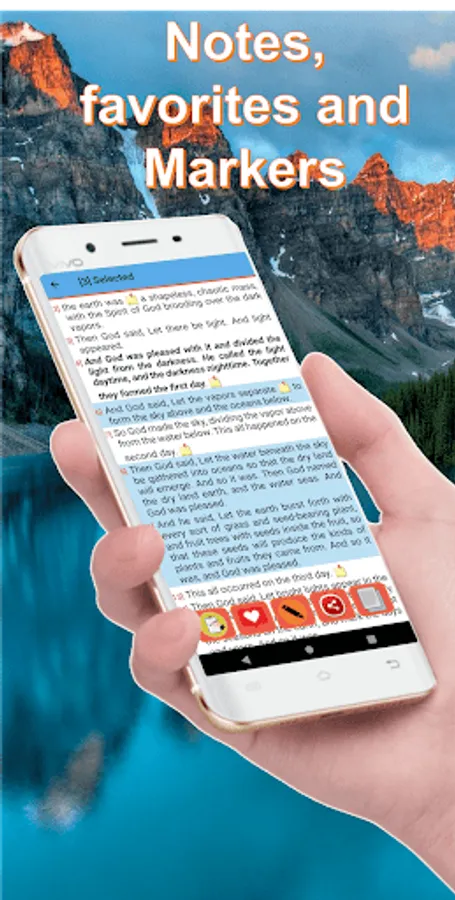 Notification Daily a verse. You can click on the screen and the lower part will show the name of the book and the chapter, when pressed, the list of books will appear and in the other the chapters that the selected book has. You can select one or several verses of a chapter and mark as a favorite you can also share with your friends the verses in the different social networks. By clicking on the favorite clip, you will see the verses that you marked for quick access.
