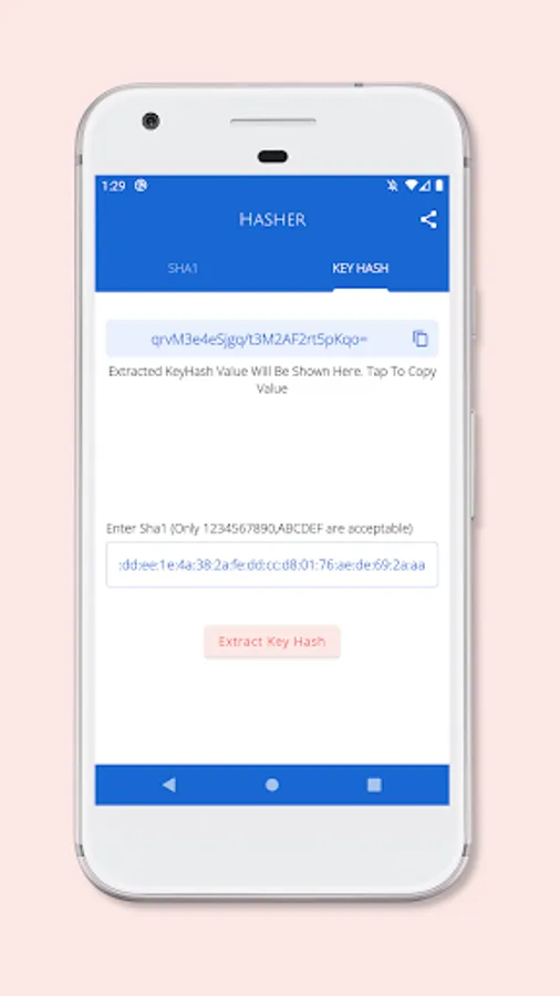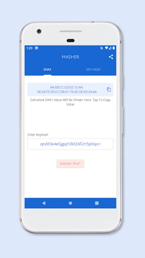 then you can extract the source Sha1 value from it. It shows the extracted value in the top textfield which you can copy by simply tapping it also print the values in logcat (under info level) .