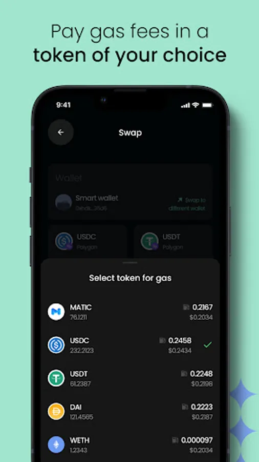 Pay gas fees in a token of your choice for transactions on your Smart wallet. Never worry about gas again.