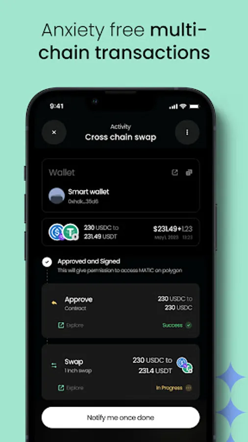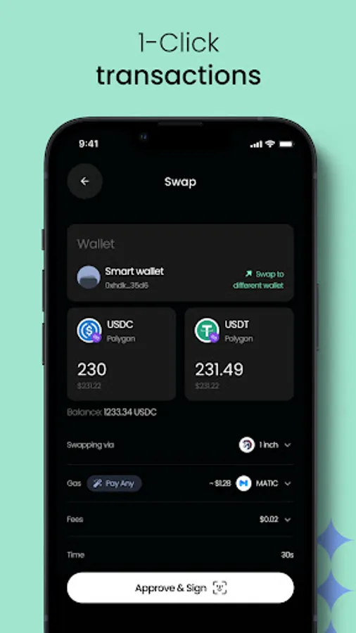 Approve and sign your swap and bridge transactions with a single click on your Smart wallet.