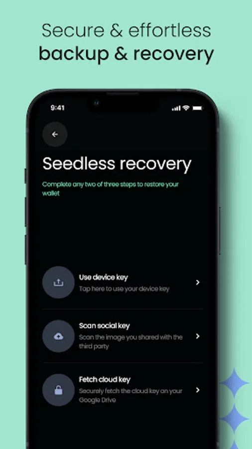 Split your seed phrase in 3 parts for enhanced security. Recover wallets using only 2 out of the 3 parts.