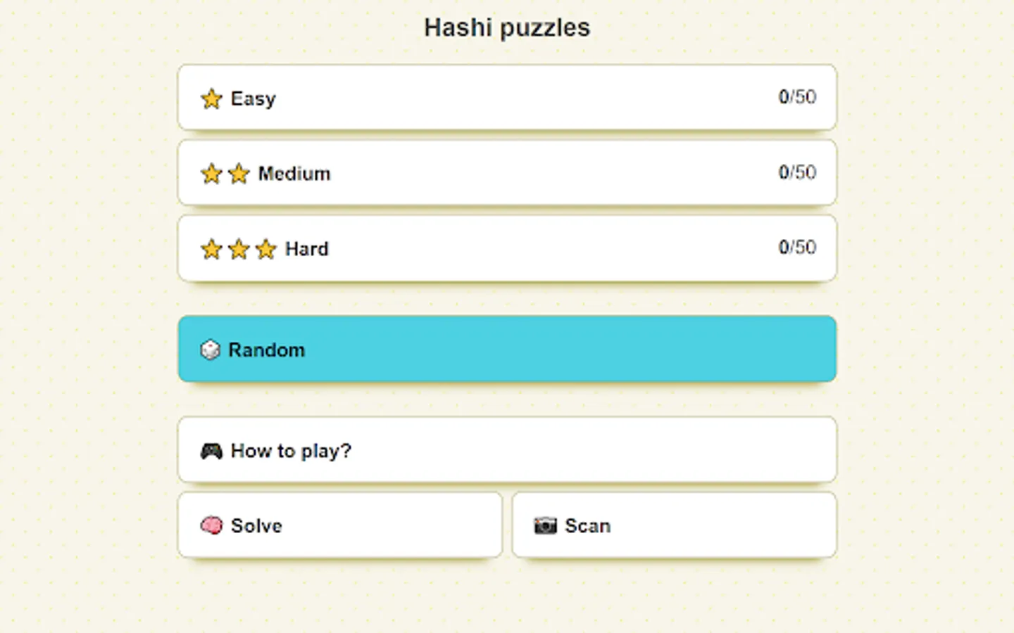 Play various levels, from easy to hard, of the popular Hashi (Bridges, Hashiwokakero) Japanese puzzle. After you solve all the levels, there are thousands of puzzles in the random section of the application.