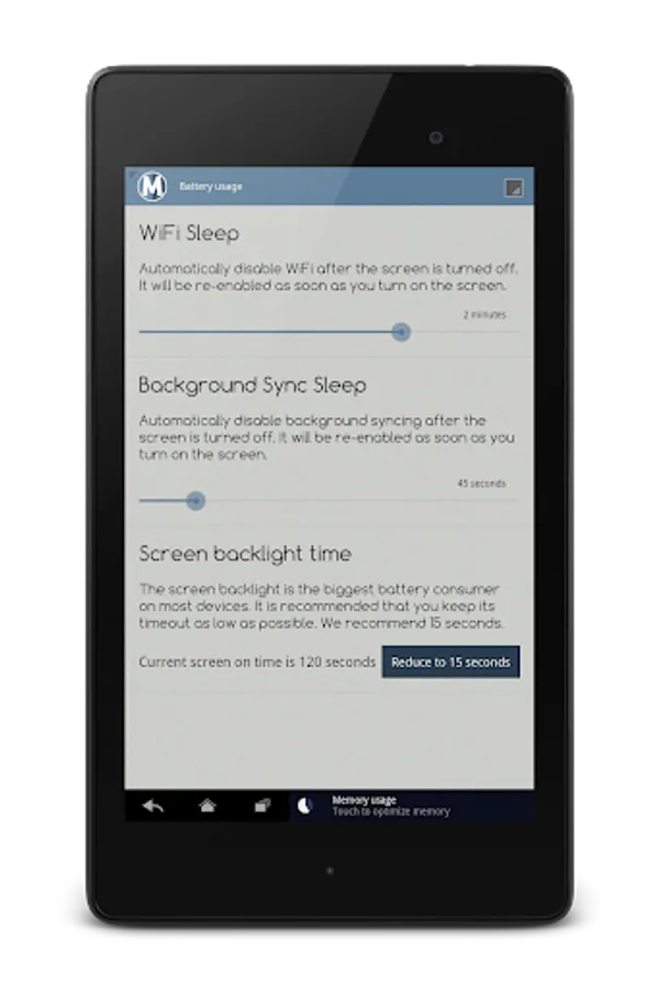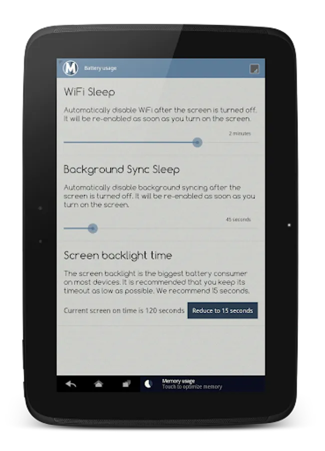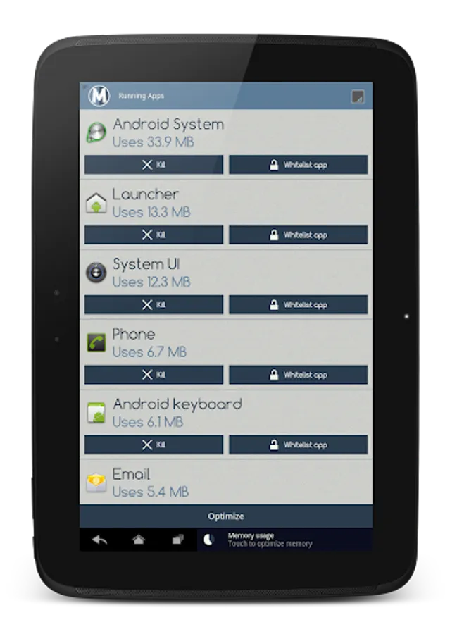 MEMbo kills those memory hogs and makes your Android usage smooth and fast again. Don't wait for those nasty "out of memory" warnings and "app not responding" popups. Stop them with a single tap and take back the control of your device's memory.