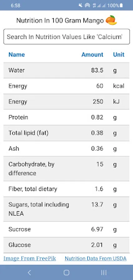 All the fruit nutrition values are sourced from the USDA official website with proper attribution.