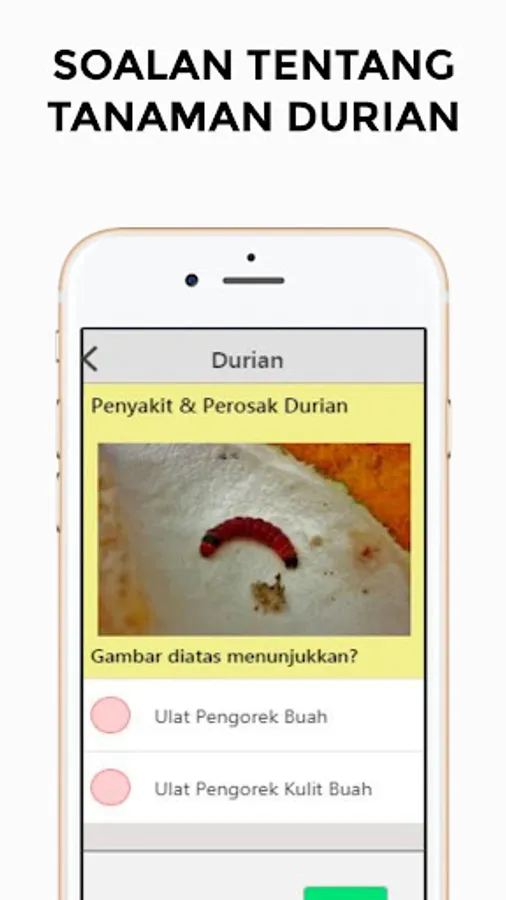 Malaysian agricultural quizzes include Durian diseases, Durian pests, Durian fertilizers, banana diseases, banana pests, fertilizer fertilizer knowledge as well as other agricultural knowledge for consumers' understanding. We will also be quizing on other crops such as pineapple, papaya, vegetable, rice, drip irrigation and more.