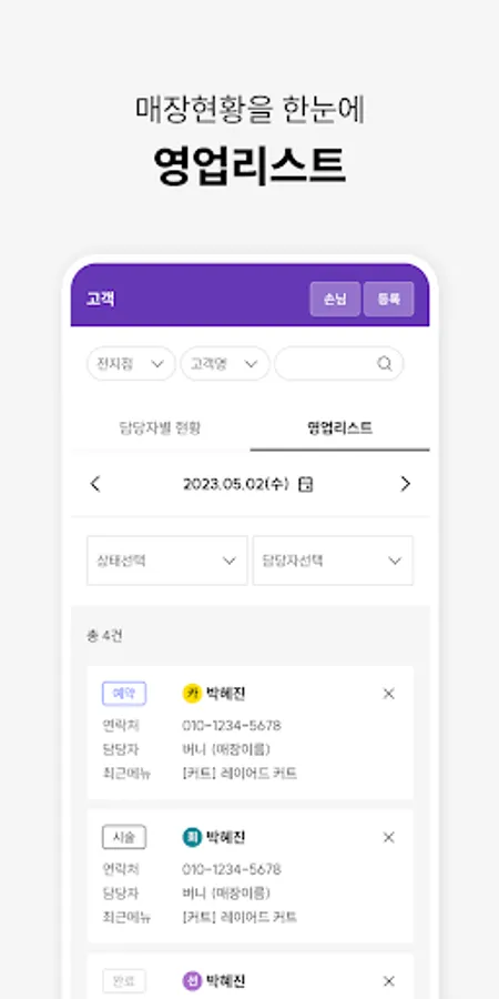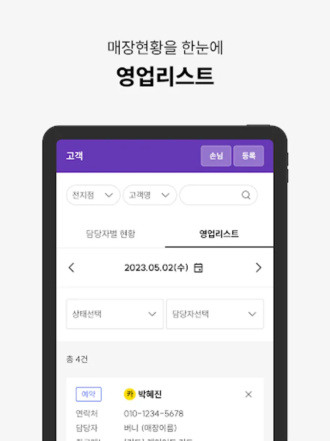 Various and accurate analysis of the overall status and sales of customers, such as customer visit status, visit trends, prepaid/membership status, by contact person, by day, by business division, by month and target.