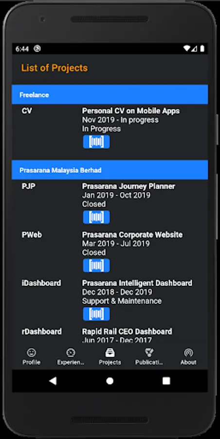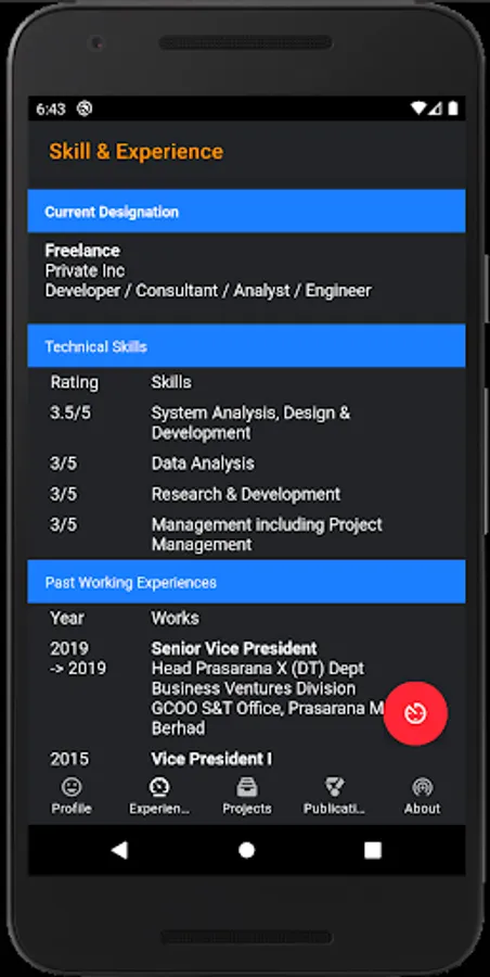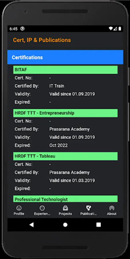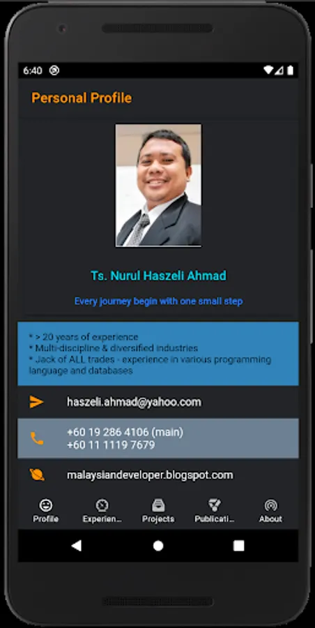 The app will be used to display my personal information and working experiences. It is a showcase of my ability as Jack of ALL trades. It has my contact information, past working experiences, previous projects and my role, and lastly my current cert (as at Dec 2019)