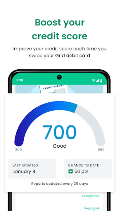 We’ll help you improve your credit score as you spend with your Grid card. The more you spend, the faster your score will improve. Track your progress and estimated future score easily though the app.