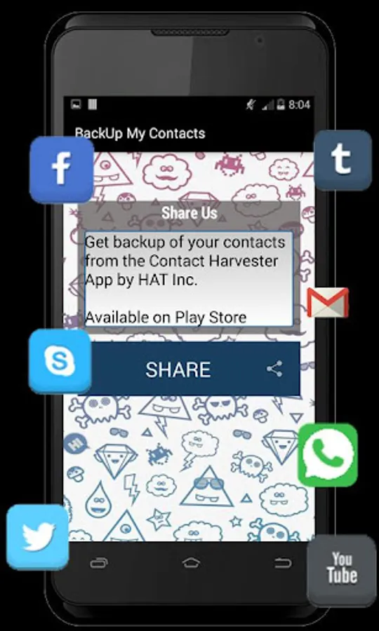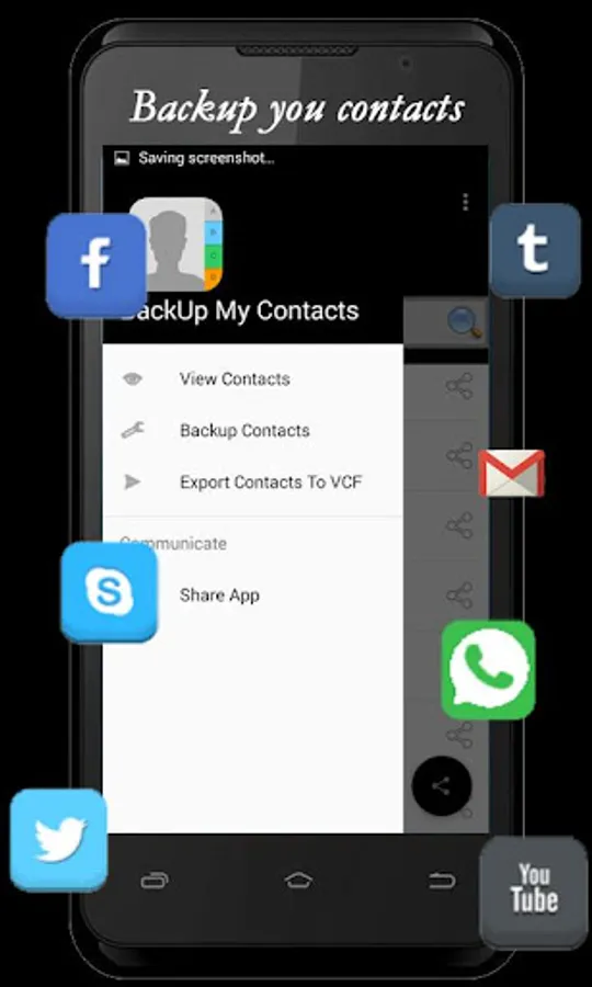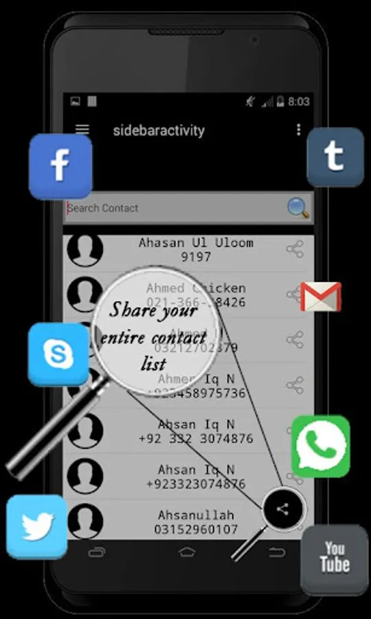 Share Your Contact List On Popular Social Media etc. You can Back Up Your Contact list Locally on your Mobile or PC in Text , CSV , Excel , VCF and can also migrate your contacts from Android to another Android , Windows fone , Nokia , Apple IOS and BlackBerry through VCF.