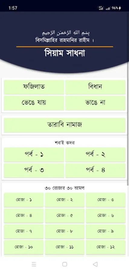 *রোজার সময়সুচি ও ক্যালেন্ডার রমজান মাসে গুরুত্বপর্ণ, সাথে রাখা হয়েছে সিয়াম সাধনা ও এর বিধান। নামাজ শিক্ষা ও প্রয়োজনীয় বিষয়াবলী দেয়া হয়েছে এবং ছোট সূরা অনুবাদসহ যাতে পড়তে ও বুঝতে সুবিধা হয়। সহজে জিকির কারার জন্য ডিজিটাল তাসবিহ রেখেছি এবং জায়নামাজ ঠিক করার জন্য কিবলা কম্পাস রাখা হয়েছে। রমজানে বেসি আমল করার জন্য মাসনুন দোয়া, আল্লাহর ৯৯ নাম অর্থ ও ফজিলত সহ সবে বরাত, সবে কদর ও ৪০ রব্বানা দোয়া, বিশ্বজনীন ঈদ ও ঈদের এসএমএস নিয়ে এই অ্যাপটি সাজানো হয়েছে।