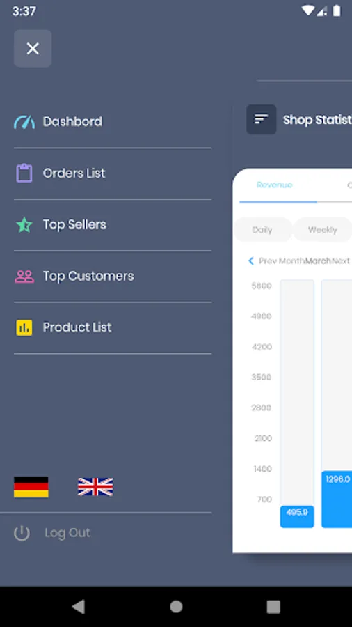 The App helps Shopware 6 store managers and administrators to get detailed statistics about their hourly, daily, weekly and monthly sales in a nice bar chart. The login to app is very simple. The users using this App need to install a related Shopware plugin from the store. This plugin will display a QR code in the inside shopware installation. When the user scans this QR code they will be logged in. They can see the statistics, recent orders, Top selling products, top customers and product list. The app is available in 2 languages, German and English.
