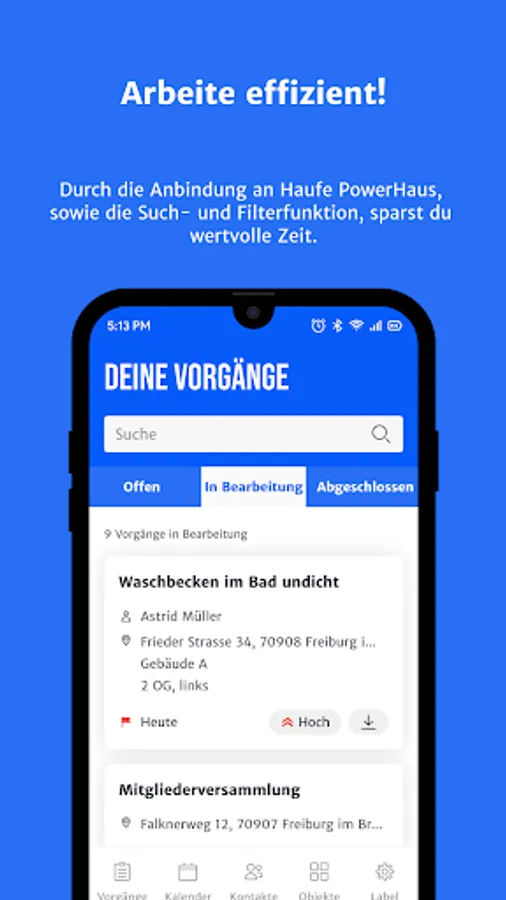 The PowerHelfer app is the ideal solution for real estate professionals who work on the move and want to have all the important information at hand at all times. The app is connected to the Haufe PowerHaus ERP system and enables users to record processes directly on site and synchronize them with PowerHaus. Even without an Internet connection, such as in the basement or in an underground car park, technical processes can be recorded so that no important information is lost. With the PowerHelfer app, facility managers and technicians always have all the relevant information at hand.
