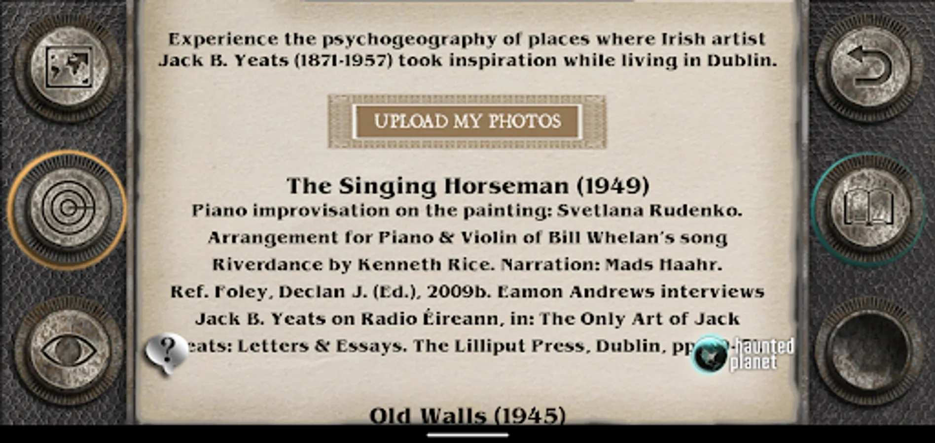 In this app, we introduce six episodes of multisensory soundscapes on six of his paintings, which are on permanent exhibition in the National Gallery of Ireland: The Liffey Swim (1923), which is placed exactly in the location of the painting’s perspective, Flower Girl (1926), Dinner Hour at the Docks (1928), Old Walls (1945), The Singing Horseman (1949), and Grief (1951). Narration for the six episodes include extracts from John B. Yeats (Jack B. Yeats’ father) who was a famous writer and from Eamonn Andrews’ interview with Jack B. Yeats on Radio Éireann. Source: Foley, Declan J. (Ed.), 2009a. The Only Art of Jack. B. Yeats, Letters & Essays. The Lilliput Press, Dublin.