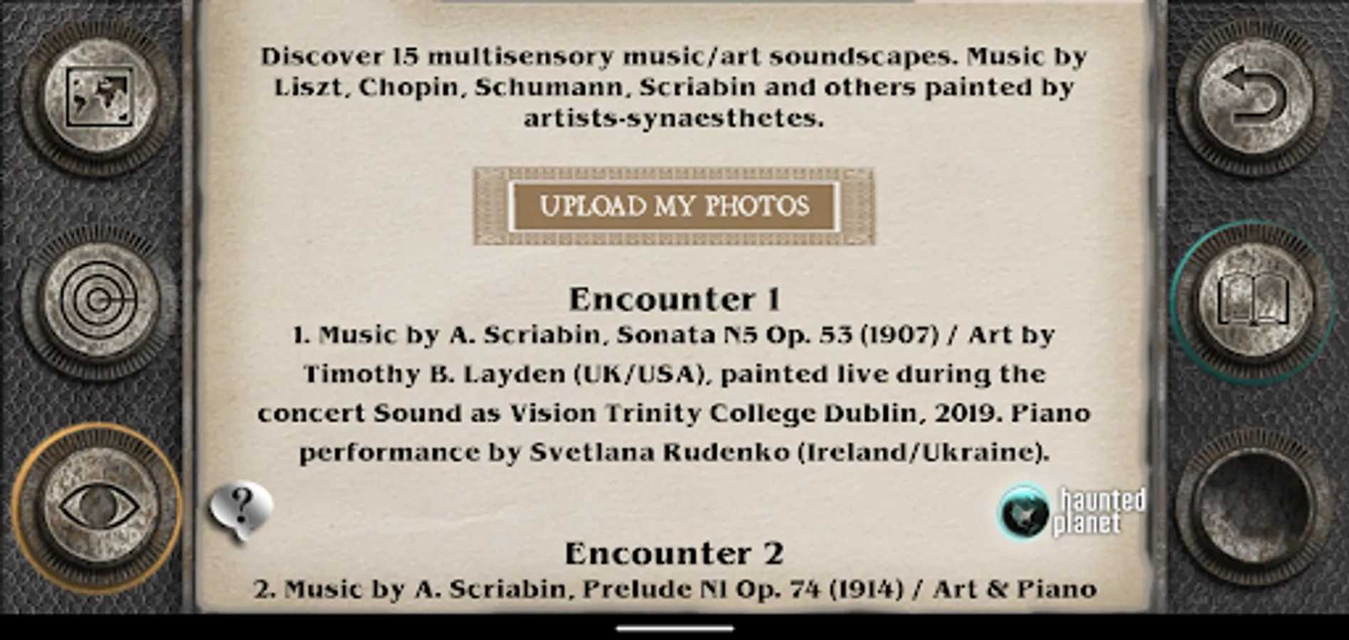 Augmented Reality (AR) art gallery with music by Liszt, Chopin, Schuman, Scriabin and others painted by artists-synaesthetes. The gallery of 15 multisensory soundscape Art episodes is the result of a seven-year collaboration between artists-synaesthetes and concert pianist, composer and researcher Dr Svetlana Rudenko, www.svetlana-rudenko.com