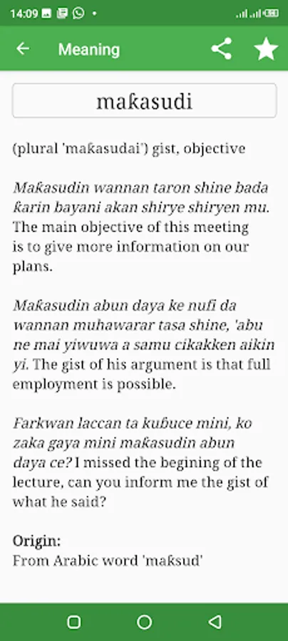 We provide Hausa to English bilingual usage sentences, pluralization of Hausa words, and origins of Hausa words derived from Arabic or English.
