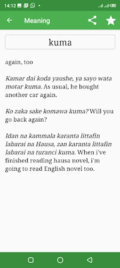 This app is an offline Hausa to English comprehensive bilingual Dictionary (or Kamus in Hausa) containing definition of thousands Hausa words and phrases in British English.