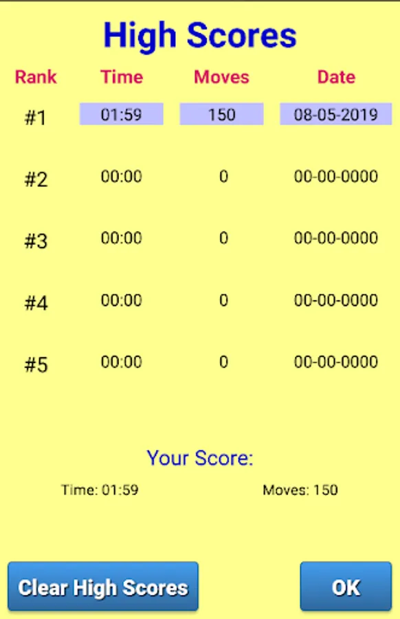 Here it is complete with a high score display of your 5 quickest solves, including how many moves it took for each.