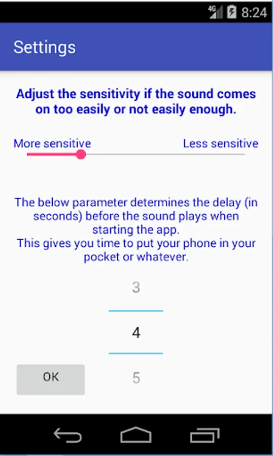 The app also has a "Settings" screen that will allow you to adjust the sensitivity for the accelerometer and a time-delay so you have time to put your phone in your pocket once you've "armed" it.