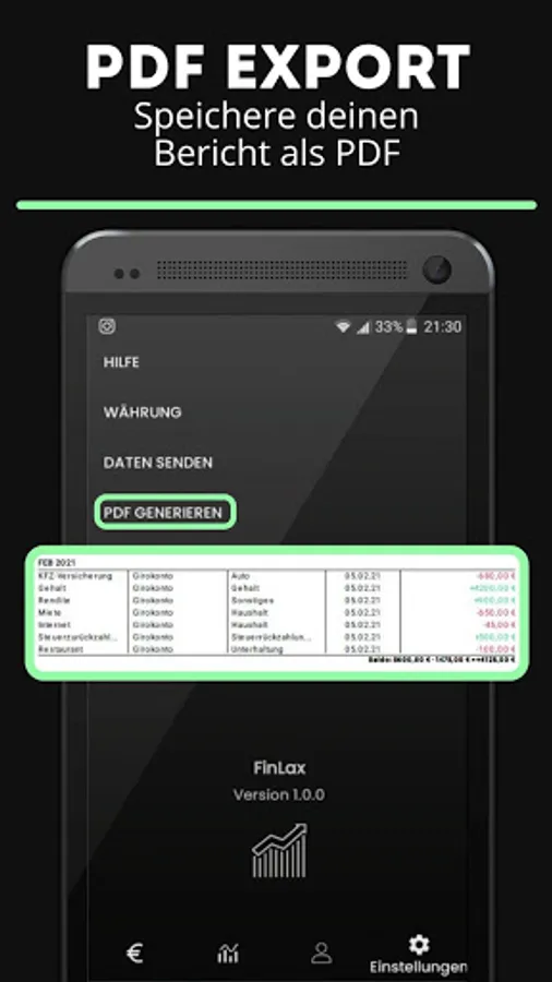 With Finlax you keep an overview of your finances. Just add your expenses, income and carry-overs to your respective accounts. You can easily and efficiently display statistics on your bookings. For a better overview, you can also export your desired billing period as a PDF with one click.
