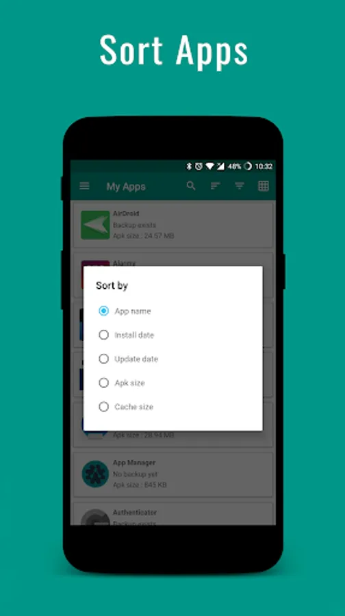• Sort apps by name, install date, update date, apk size, and cache size.