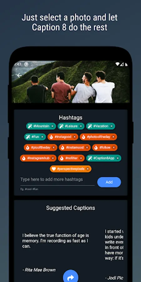Caption 8 generates hashtags from your photo using machine learning and then suggests relevant captions. you can add more hashtags to your photo and browse through the suggested captions before sharing it.