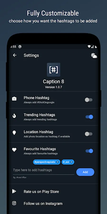 Caption 8 adds trending hashtags, location hashtags from photo location, and you can also save your favourite hashtags which can be added to every photo.