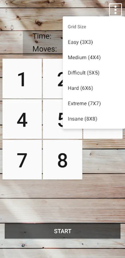 - 6 puzzle sizes: easy (3X3), medium (4X4), difficult (5X5), hard (6X6), extreme (7X7), and insane (8X8).