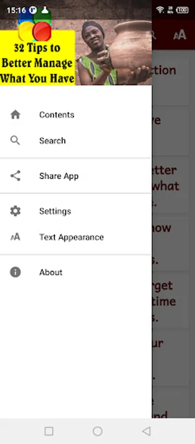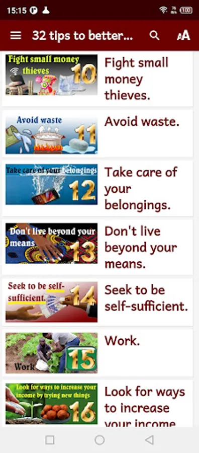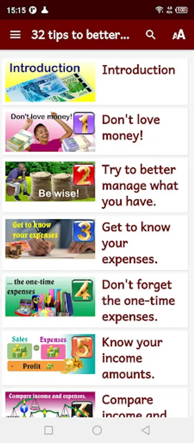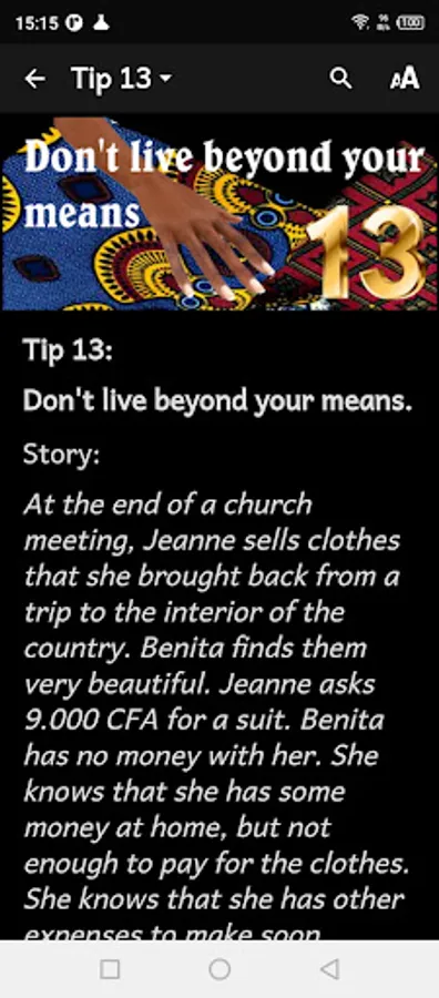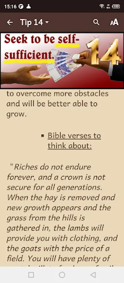 Content of the application: 32 chapters with 1 advice per chapter, a story, biblical texts to meditate on, questions to think about, practical exercises.