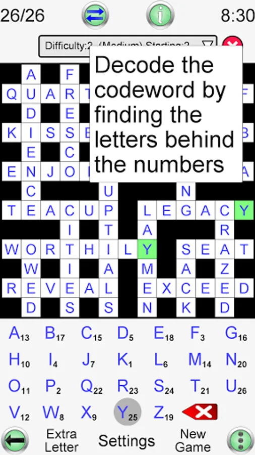 For those unfamiliar with Codeword puzzles, they provide a grid of words, similar to a normal crossword, but with no clues, rather a few initially provided letters, and a number in each square in the gird to indicate its (as yet unknown) letter. All boxes with the same number must use the same letter. From that information and the few initially provided letters it is possible to work out which words will fit in the boxes. Hence you are decoding (or decyphering) the numbers into letters to reveal the hidden words. Usually all 26 letters of the alphabet are used in the codeword, although not always (and unused letters appear crossed out in the keyboard). It is fun, challenging, and a real brain teaser.