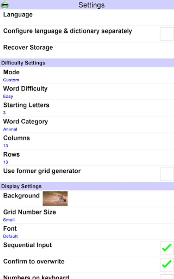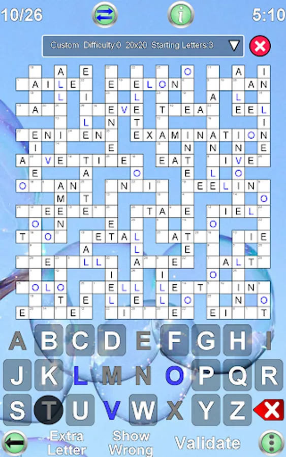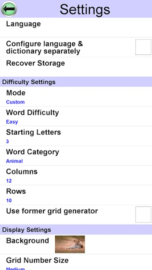3) Difficultly level can be specified by the user, which determines the pool of words the generator will use. The larger the pool the greater the difficulty. There is even an early learner mode with a limited number of words, aimed at English language learners. The number of starting letters can also be specified. Higher scores can be obtained with more difficult codewords