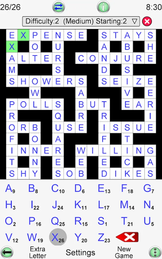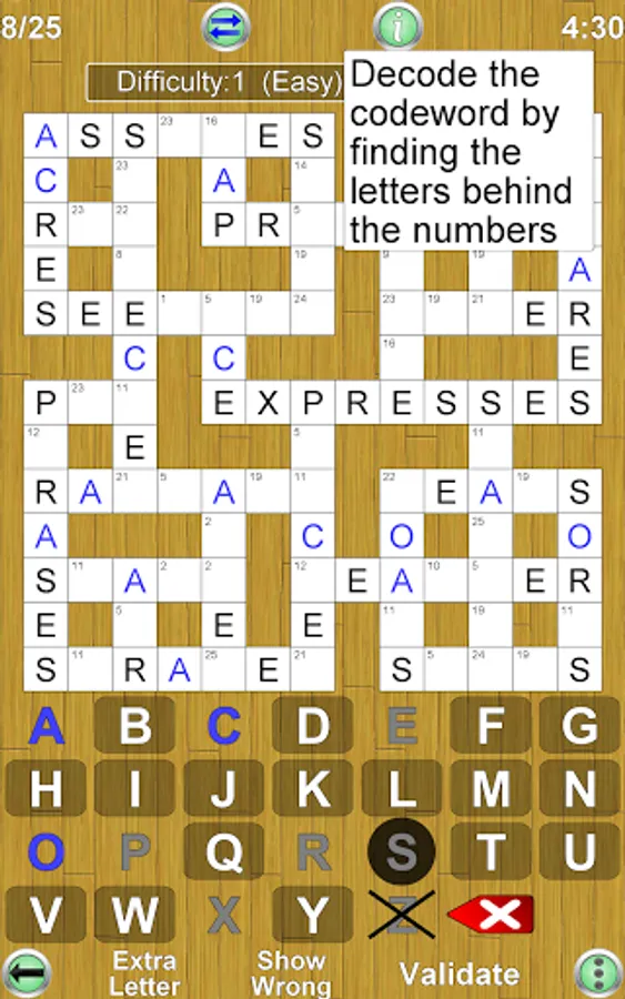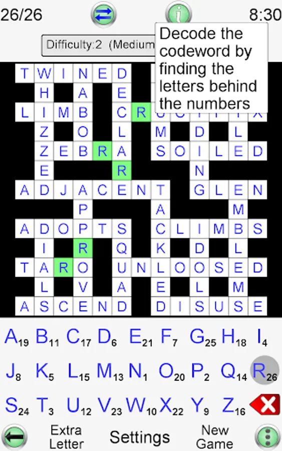 2) The game can show you potential answers for an uncompleted word. The game uses the letters that you have already decoded and displays the matching words
