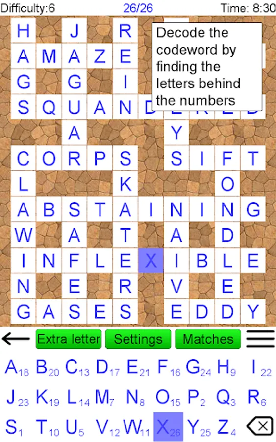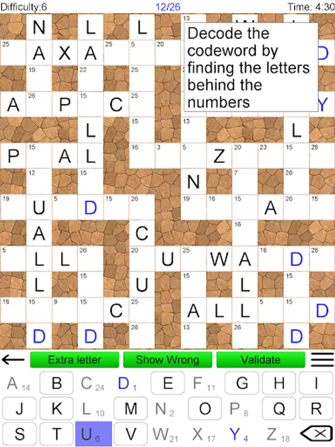 For those unfamiliar with Codeword puzzles, they provide a grid of words, similar to a normal crossword, but with no clues, rather a few initially provided letters, and a number in each square in the gird to indicate its (as yet unknown) letter. All boxes with the same number must use the same letter. From that information and the few initially provided letters it is possible to work out which words will fit in the boxes. Hence you are decoding (or decyphering) the numbers into letters to reveal the hidden words. Usually all 26 letters of the alphabet are used in the codeword, although not always (and unused letters appear crossed out in the keyboard). It is fun, challenging, and a real brain teaser.