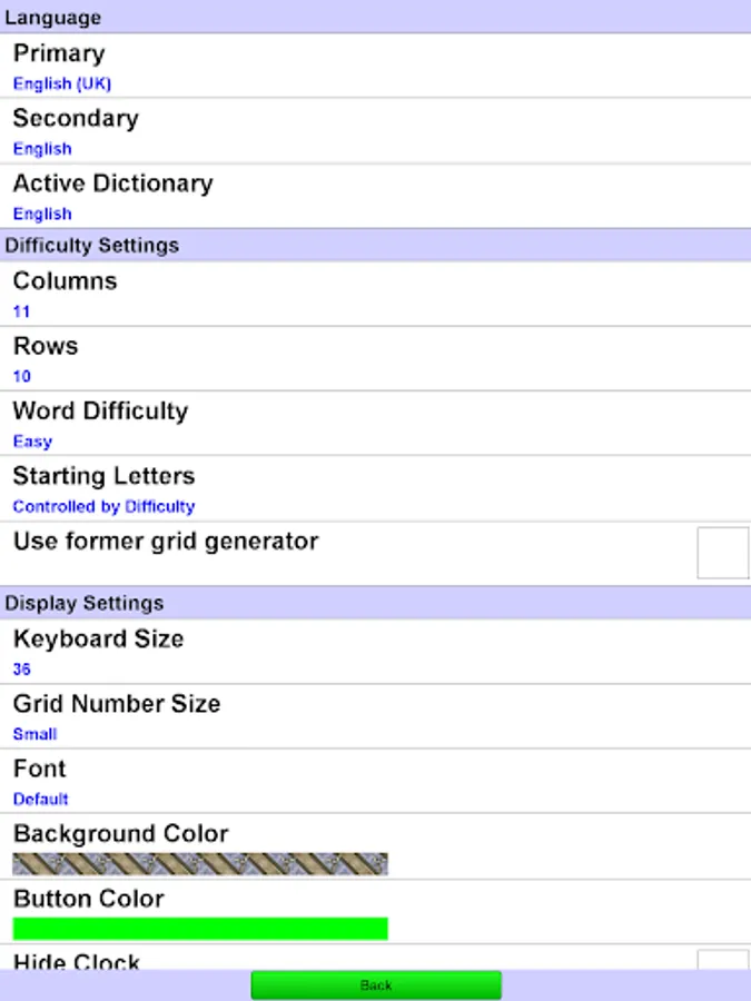 3) Difficultly level can be specified by the user, which determines the pool of words the generator will use. The larger the pool the greater the difficulty. There is even an early learner mode with a limited number of words, aimed at English language learners. The number of starting letters can also be specified. Higher scores can be obtained with more difficult codewords