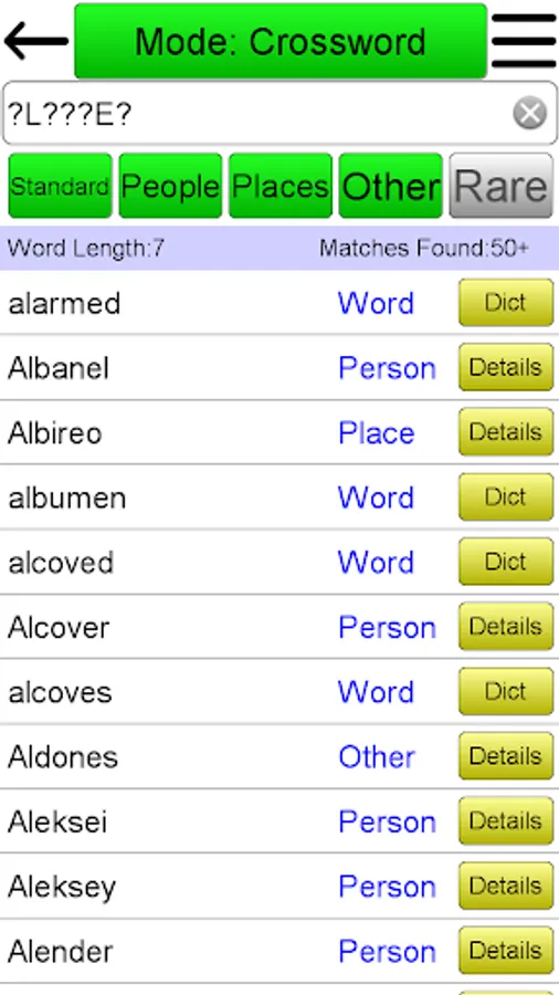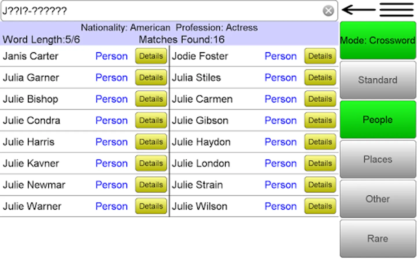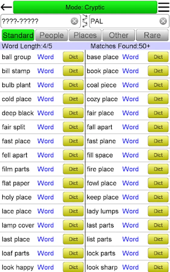 4) Contains 5 different modes for help solving Crosswords, Anagrams, Synonyms, Codeword, and Cryptic Crosswords. Codeword mode allows the user to specify which letters are already known (and hence not considered for the unknown letters), and which unknown letters are the same (i.e have the same Codeword number). Cryptic mode contains extra help with many examples.