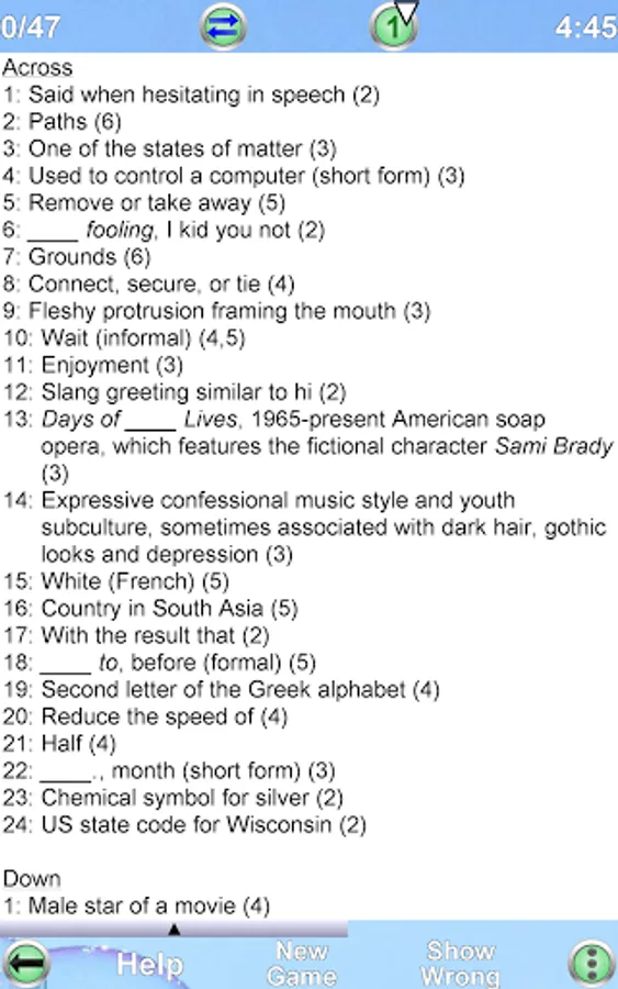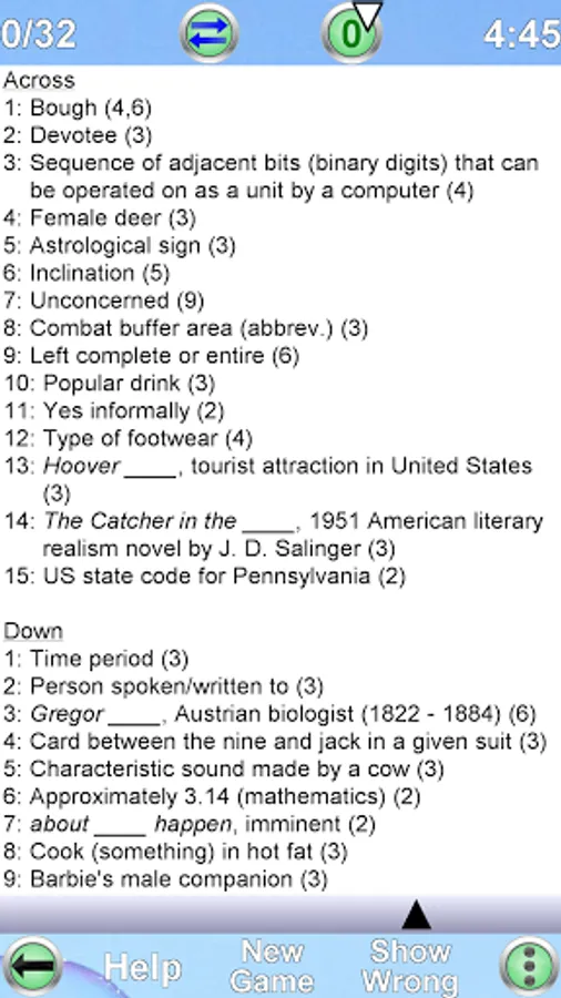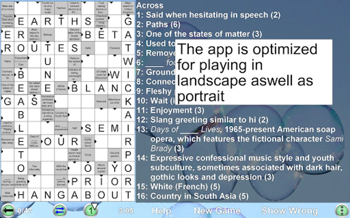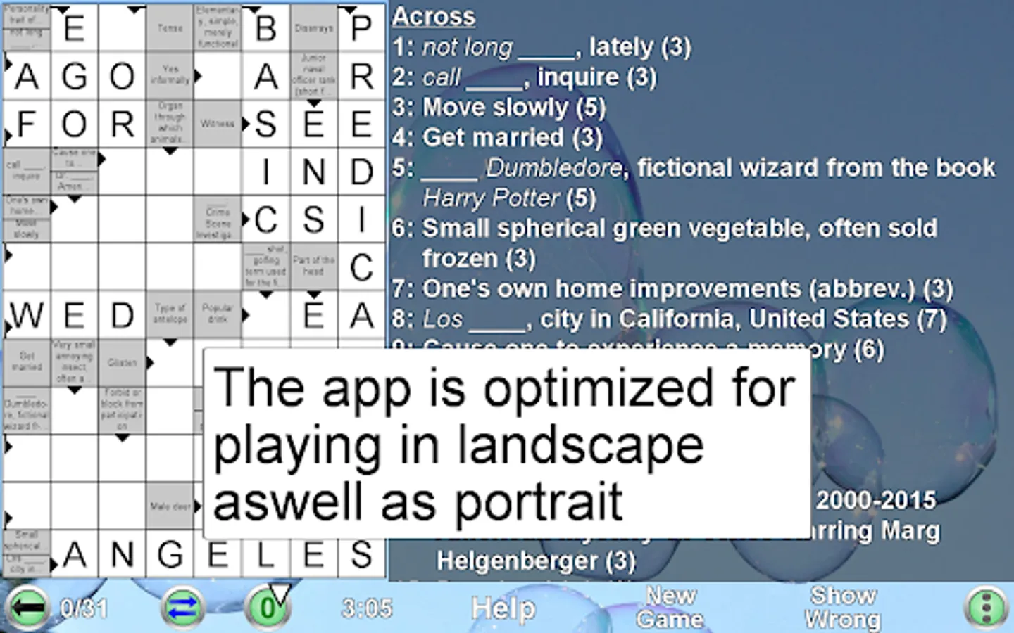 • Each new game is created by the app automatically. Therefore you can play an unlimited number of crosswords!!
