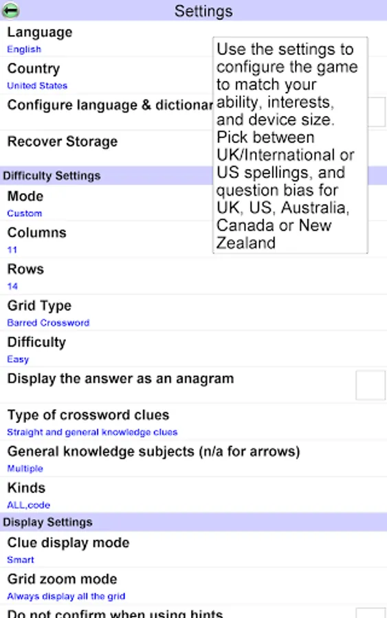 • Very configurable game generator. You decide the grid size, difficulty and many other things