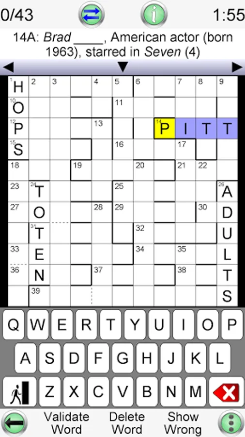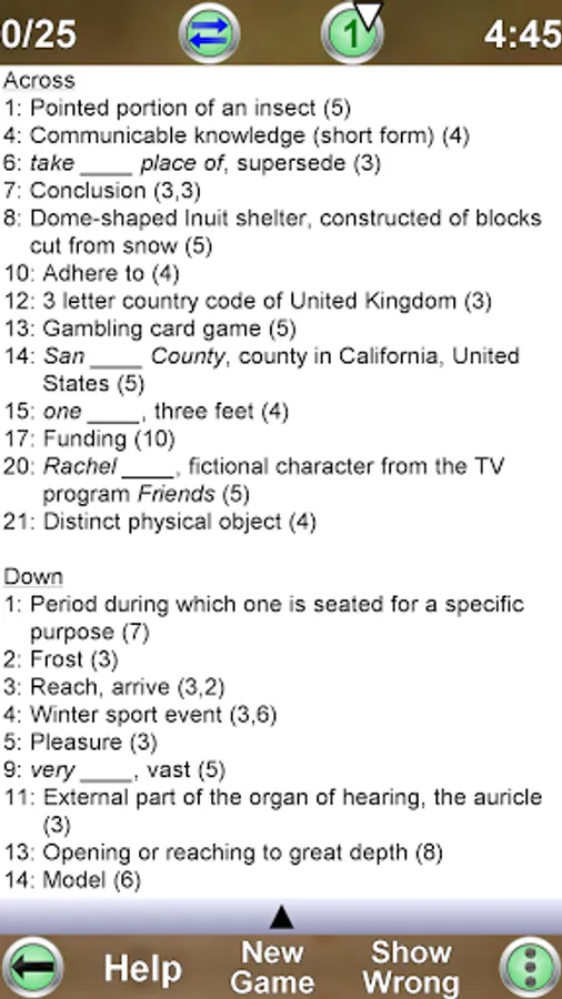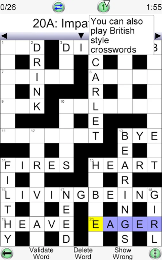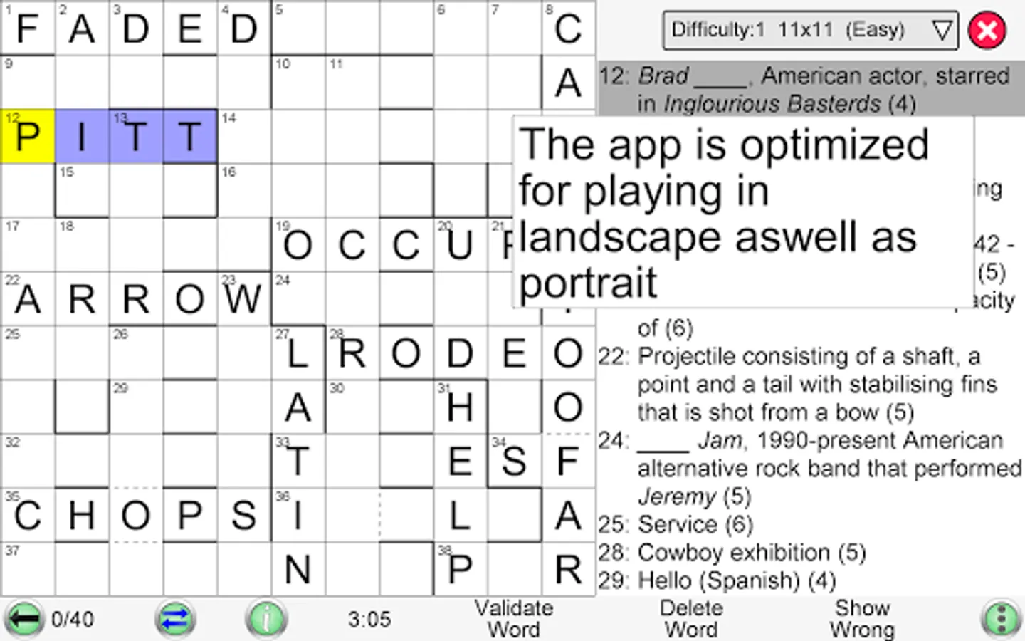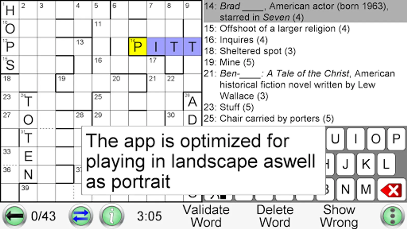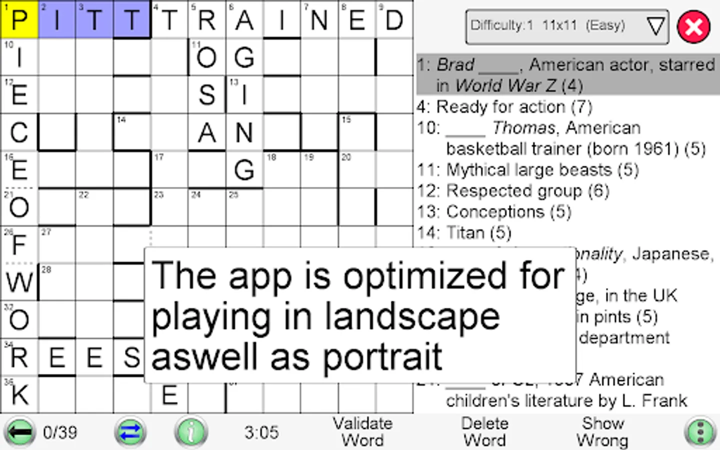 • Each new game is created by the app automatically. Therefore you can play an unlimited number of crosswords!!