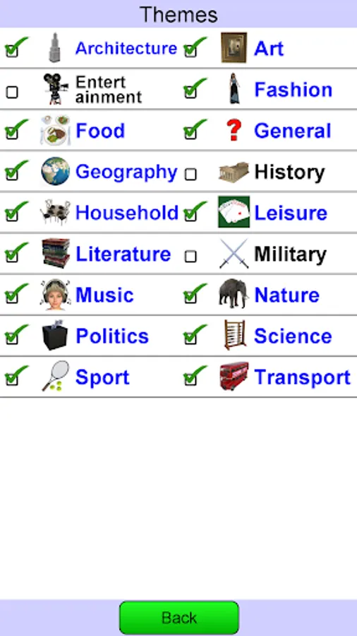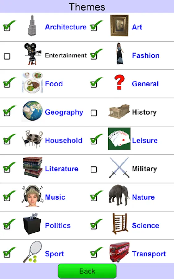 Topics covered by the packs: entertainment, fashion, food, geography, history, art, science, sport, household, leisure, literature, military, music, nature, transport