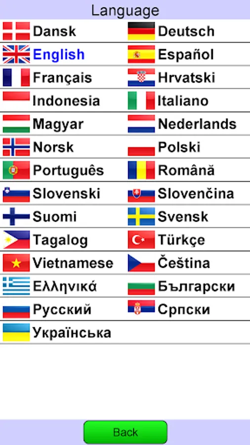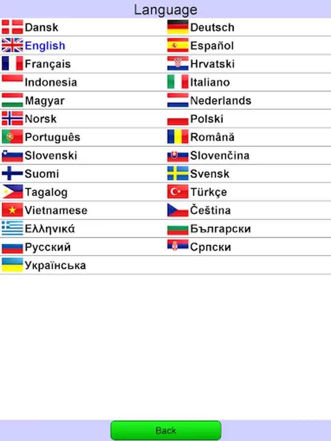 You can play this app in the following languages: English, French, German, Spanish, Portuguese, Italian, Dutch, Swedish, Danish, Norwegian, Finnish, Polish, Hungarian, Czech, Russian, Arabic, Bulgarian, Bosnian, Croatian, Greek, Indonesian, Romanian, Serbian, Serbo-Croatian, Slovak, Slovene, Turkish, Ukrainian, Afrikaans, Albanian, Azeri, Estonian, Latvian, Lithuanian, Catalan, Galician, Tagalog, Armenian, Belarusian, Georgian, Hebrew, Hindi, Malay, Persian, Thai, Urdu, Vietnamese