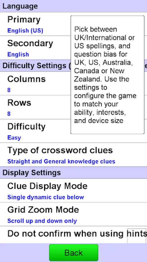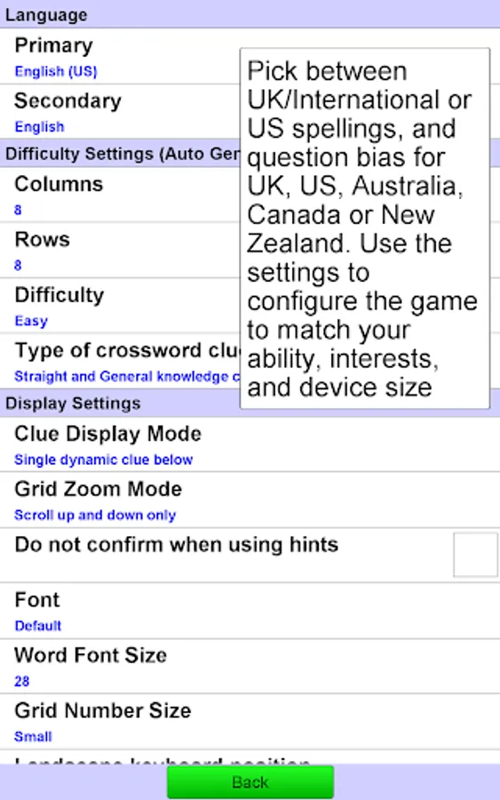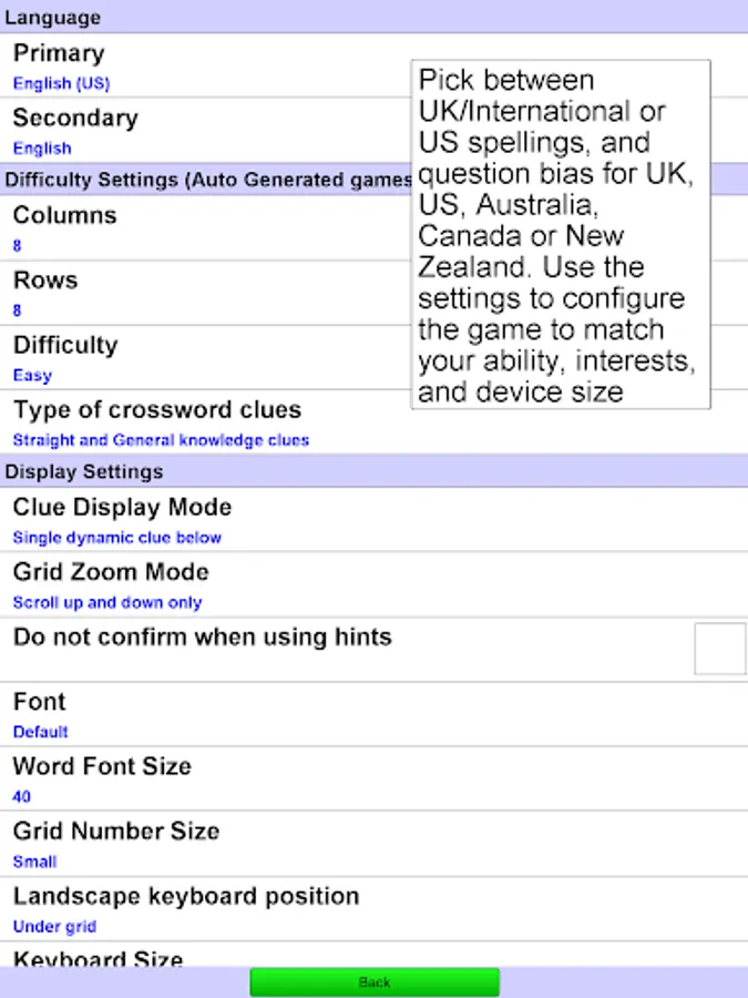 • There is a large range of built in grids, from sizes 11x11, 13x13 and 15x15 at different difficulty levels. Most have just 16% black squares, per the standard definition
