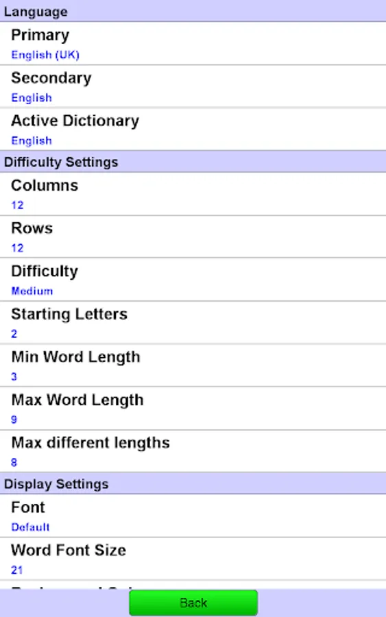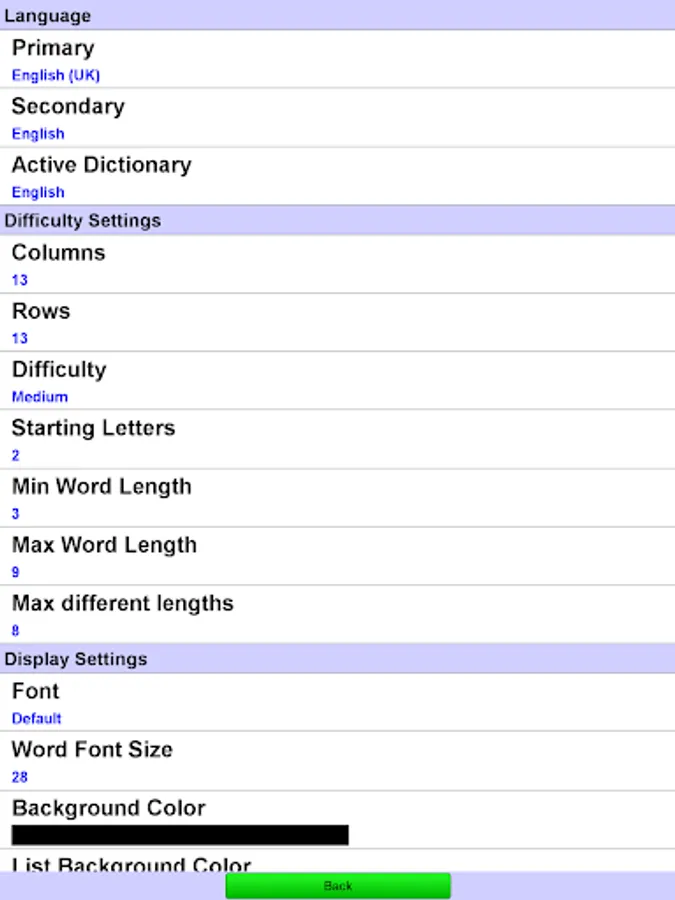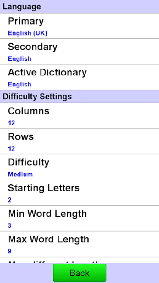 This helps avoid searching for many small words (a common problem in word apps). Also useful for specifying really difficult games (e.g. set both minimum and maximum word length to three).