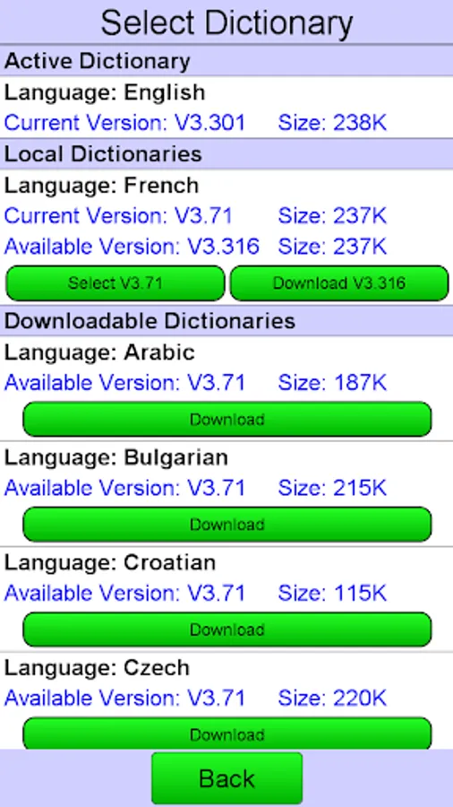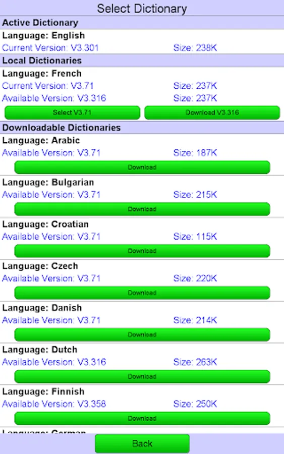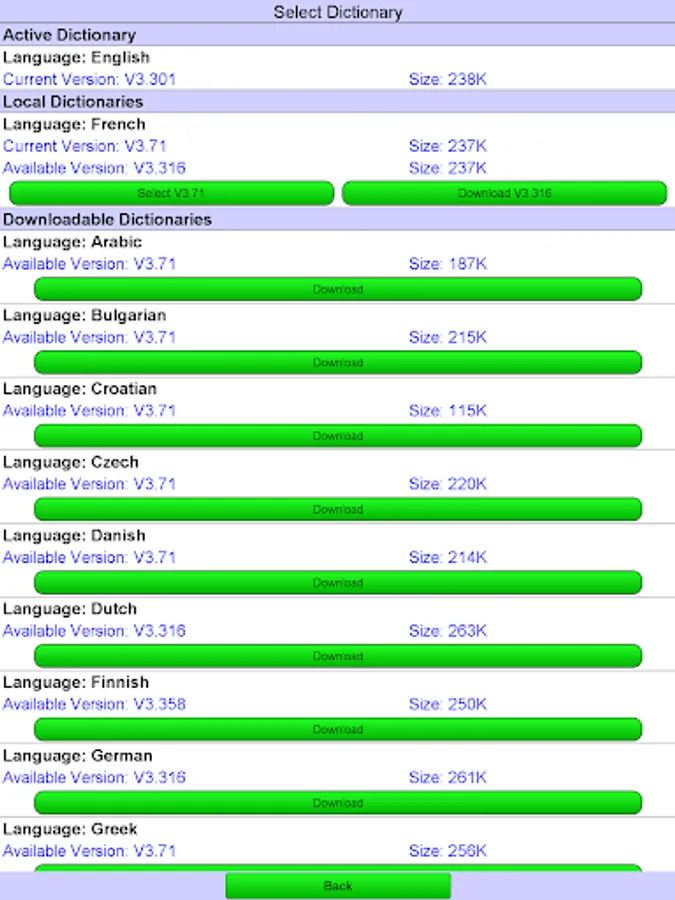 Dictionaries available are English, Spanish, Portuguese, Russian, Arabic, French, German, Italian, Indonesian, Bulgarian, Croatian, Czech, Danish, Greek, Hungarian, Polish, Romanian, Serbian(Latin), Serbian(Cyrillic), Slovak, Slovene, Swedish, Turkish, Ukrainian and more coming later