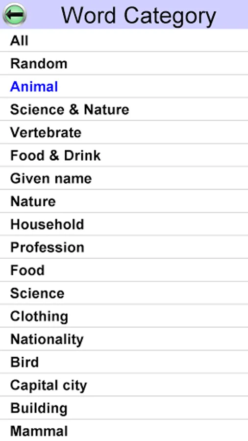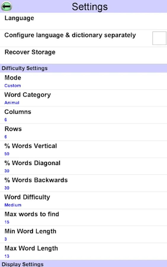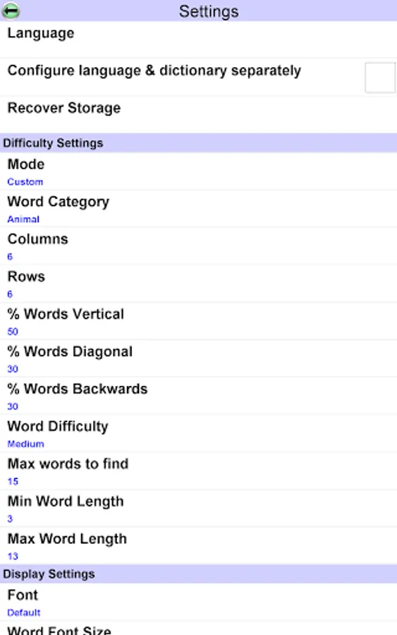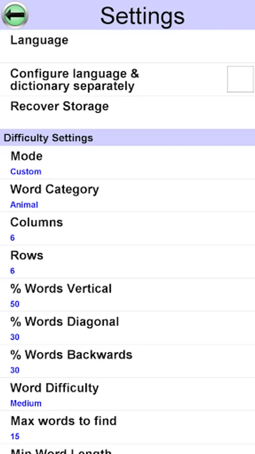 This helps avoid searching for many small words (a common problem in word apps). Also useful for specifying really difficult games (e.g. set both minimum and maximum word length to three).